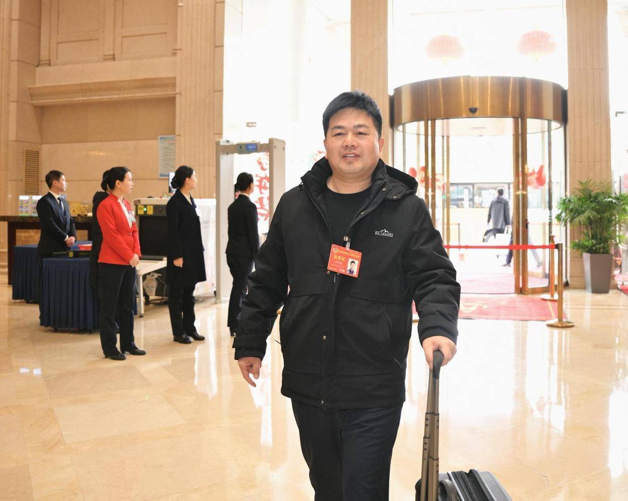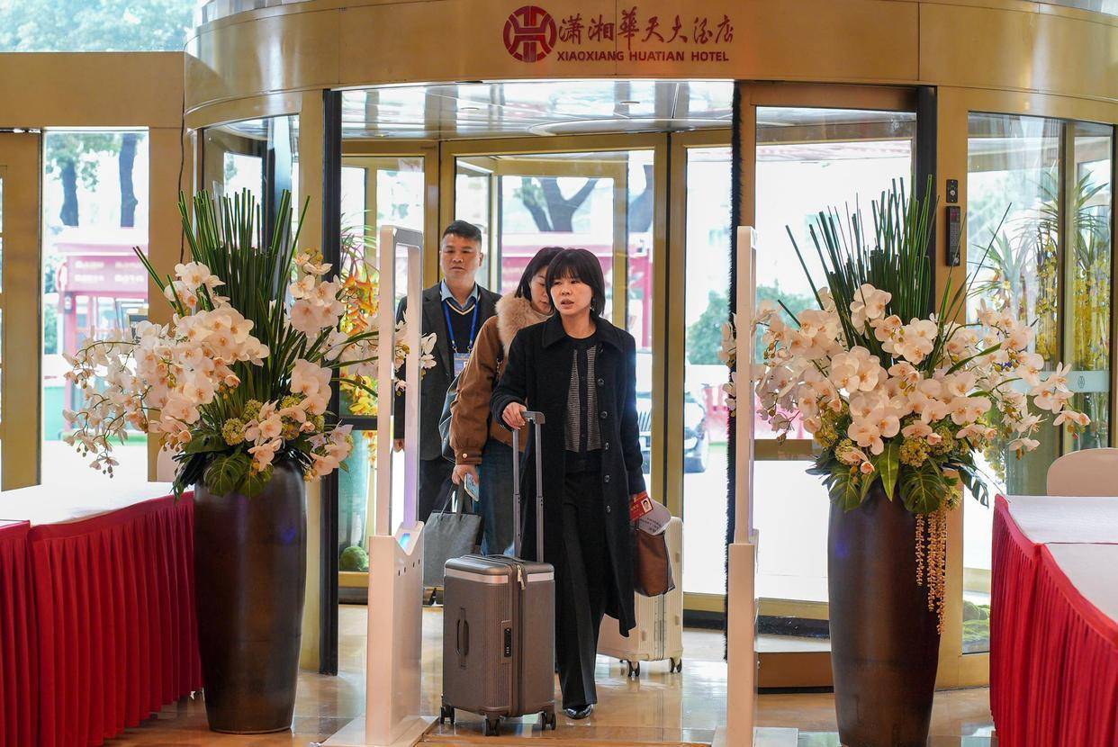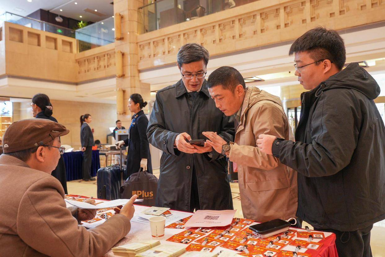 在潇湘华天酒店大堂里,一片繁忙而有序的景象。大堂入口处的长桌上,委员们的证件被整齐地摆放成若干列,工作人员正有条不紊地核对信息。委员们拖着行李箱,风尘仆仆却又精神饱满地步入大厅。