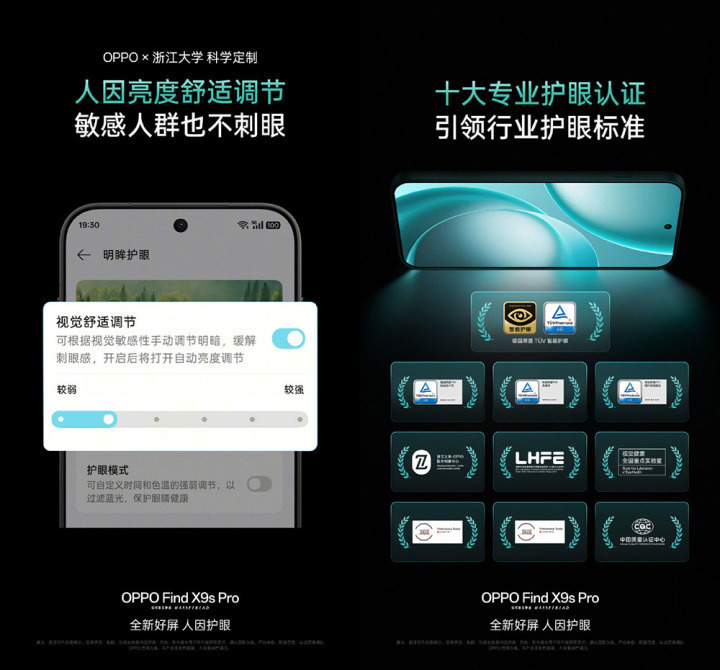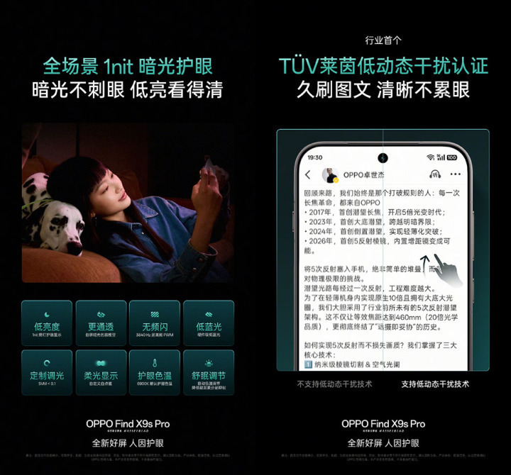 另外,所谓首个TÜV莱茵低动态干扰认证,结合 @OPPO周意保 和官宣的信息来看,这项认证主要针对文字阅读场景,通过优化动态显示效果,让屏幕在滚动浏览大量文字时,字符边缘更清晰稳定,从而减轻眼睛的调节负担,实现“久刷不累眼”。配合全场景1nit暗光显示、硬件级低蓝光等特性,以及累计获得的十大专业护眼认证,Find X9s Pro在护眼领域构建了全方位的技术壁垒。